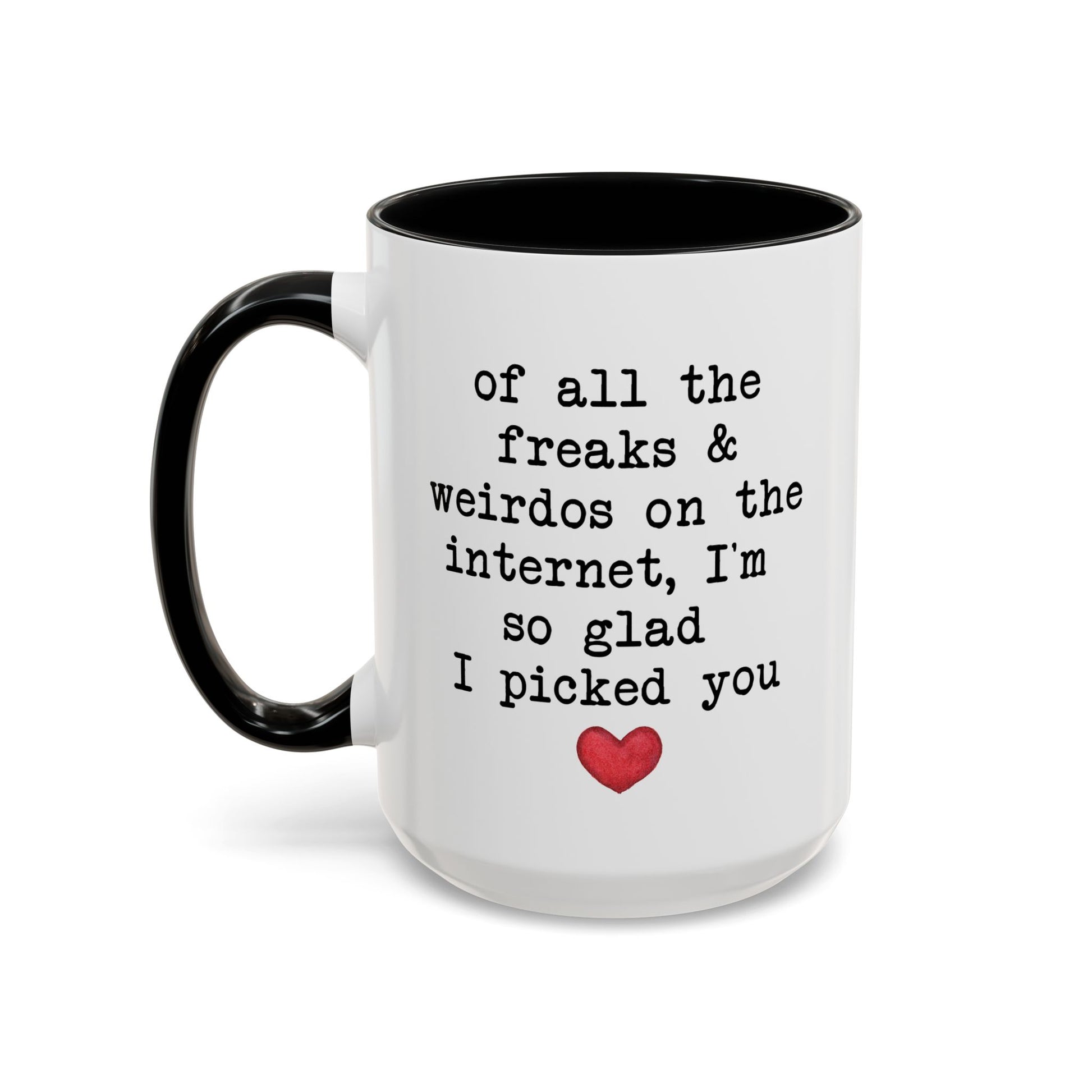 This 15oz ceramic coffee mug ☕❤️ is made for your person — the one you met online, bonded with over memes, and somehow decided was worth keeping 😌💻 The sarcastic-sweet quote is perfect for couples, best friends, or soulmates who proudly embrace their shared weirdness and inside jokes 🖤😂